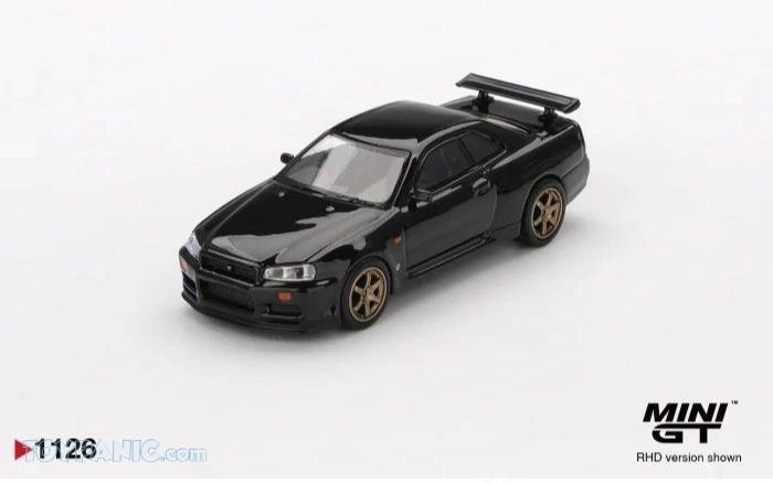 1/64 MiniGT Nissan Skyline GT-R (R34) V-Spec In Black Pearl Finish With TE37 Wheels