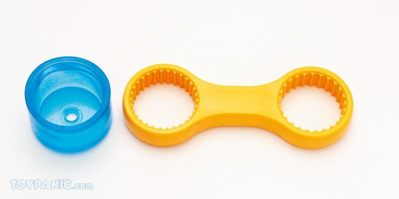The flat shaped spectacle wrench has a socket for “Mr. Color GX use” and “Water based hobby color use” on either end, and one for “Mr. Color use” is molded into the rear side. There is a dedicated non-slip grip to hold the bottle more easily while using the wrench to turn the cap.